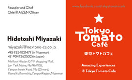 Tokyo Tomato Cafeの名刺です。弊社はファランチャイザーとしてミャンマーを中心にアジアに店舗を展開していきます。