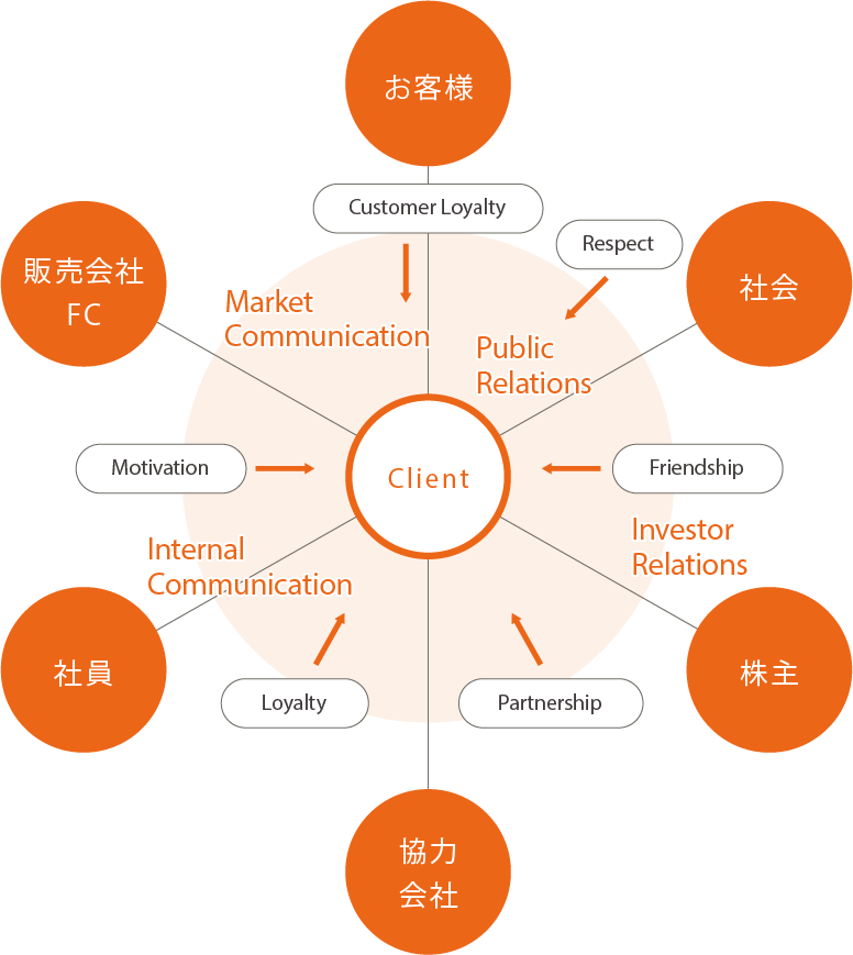 当社では、企業を取り巻くステークホルダー(利害関係者)を下記の図のように6つにわけて考え、トータルの広報コンセプトの作成やそれぞれのフィールドにおけるベ ストなコミュニケーションの在り方をご提案します。